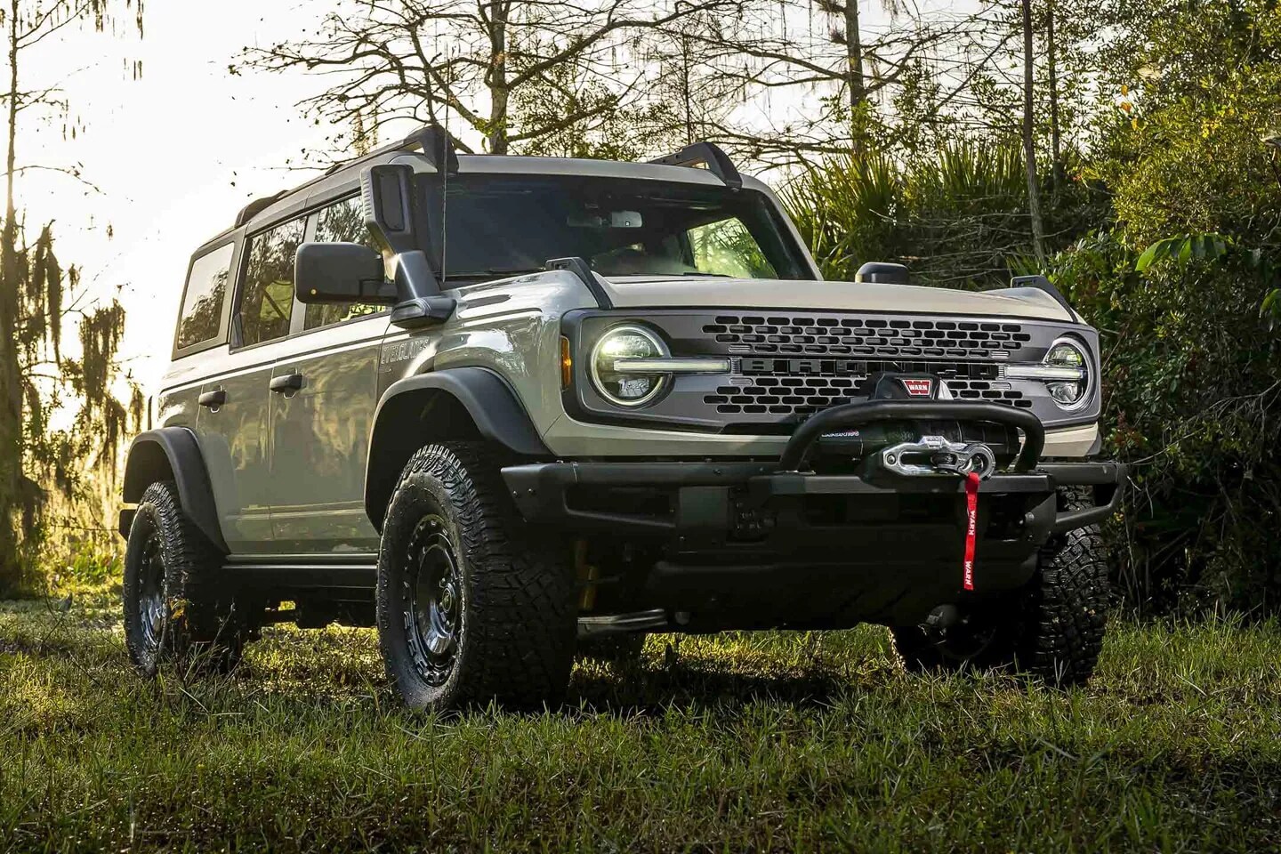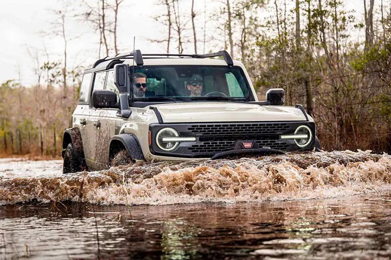 The new 2022 Bronco Everglades will be equipped with a Bronco-first, factory-installed Ford Performance by WARN® winch kit and air-intake snorkel, perfect for confidently taking on extra-muddy trails and overland treks. Preproduction model shown with optional equipment and Ford Accessories. Always determine the water depth before attempting a crossing and proceed slowly. Refer to your Owner's Manual for detailed information regarding driving through water. Available summer 2022. Limited availability.