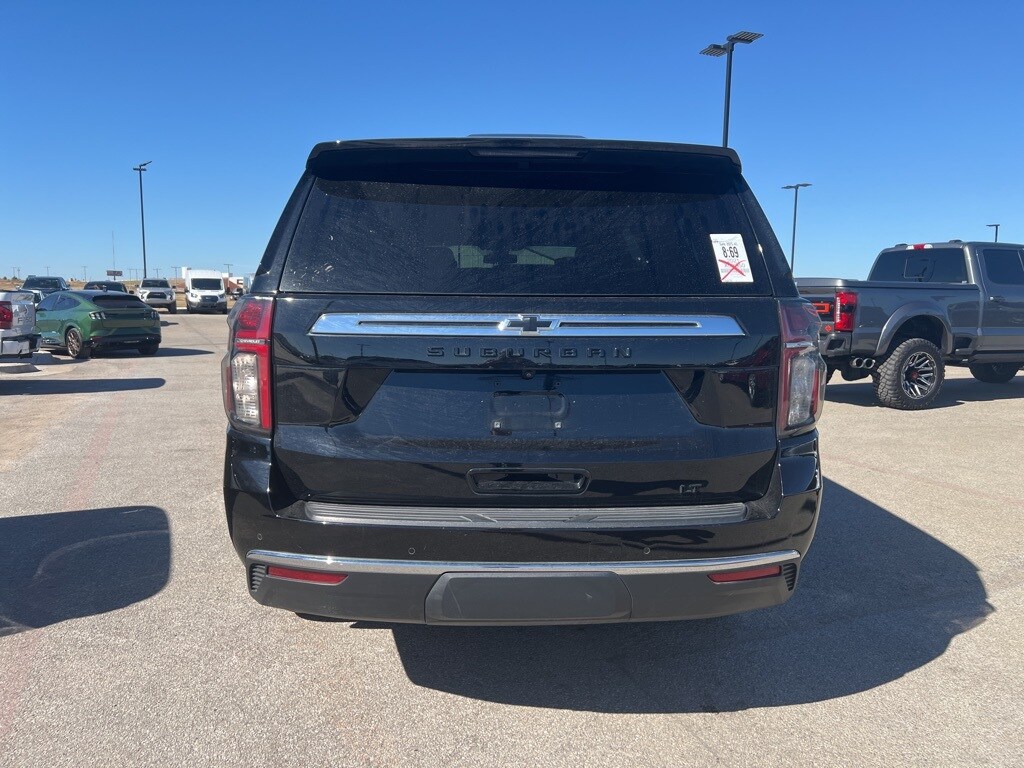 License Plate Front Mounting Package, Preferred Equipment Group 1LT (10-Way Power Driver & Passenger Seat Adjusters, 1st & 2nd Row Color-Keyed Carpeted Floor Mats, 2 USB Data Ports, Auto-Dimming Inside Rear-View Mirror, Bose 9-Speaker Stereo Audio System Feature, Bright Front & Rear Door Sill Plates, Color-Keyed Carpeting Floor Covering, Driver & Front Outboard Passenger Airbags, Floor Console w/Storage Area, Hands-Free Rear Power Programmable Liftgate, HD Radio, Heated Driver & Front Passenger Seats, Infotainment Display, Leather-Wrapped Steering Wheel, LED Daytime Running Lamps, Memory Settings For Driver, Remote Start, SiriusXM Radio w/360L, and Universal Home Remote), Rear Media & Nav Package (Radio: Chevrolet Infotainment 3 Premium System and Rear Seat Media System), Suburban LT, 4D Sport Utility, EcoTec3 5.3L V8, 4WD, Black, Black Leather, Dual-Pane Power Panoramic Sunroof, 2nd Row Manual Bucket Seats, 3.23 Rear Axle Ratio, 3rd row seats: split-bench, 4-Wheel Disc Brakes, 9 Speakers, ABS brakes, Air Conditioning, Alloy wheels, AM/FM radio: SiriusXM with 360L, Apple CarPlay/Android Auto, Auto High-beam Headlights, Auto-dimming Rear-View mirror, Automatic temperature control, Black Exhaust Tip (LPO), Black Name Plates (LPO), Brake assist, Bumpers: body-color, Compass, Delay-off headlights, Driver door bin, Driver vanity mirror, Dual front impact airbags, Dual front side impact airbags, Electronic Stability Control, Emergency communication system: OnStar and Chevrolet connected services capable, Four wheel independent suspension, Front & Rear Black Bowtie Emblems (LPO), Front anti-roll bar, Front Bucket Seats, Front Center Armrest, Front dual zone A/C, Front reading lights, Fully automatic headlights, Garage door transmitter, Heated door mirrors, Heated Front Seats, Illuminated entry, Leather Seating Surfaces, Leather steering wheel, Low tire pressure warning, Memory seat, Molded Splash Guards, Occupant sensing airbag, Outside temperature display, Overhead airbag, Overhead console, Panic alarm, Passenger door bin, Passenger vanity mirror, Power door mirrors, Power driver seat, Power Liftgate, Power passenger seat, Power steering, Power windows, Premium audio system: Chevrolet Infotainment 3 Plus, Premium Smooth Ride Suspension, Radio: Chevrolet Infotainment 3 Plus System, Rain sensing wipers, Rear air conditioning, Rear anti-roll bar, Rear reading lights, Rear seat center armrest, Rear window defroster, Rear window wiper, Remote keyless entry, Roof rack: rails only, Security system, Speed control, Speed-sensing steering, Split folding rear seat, Spoiler, Steering wheel mounted audio controls, Tachometer, Telescoping steering wheel, Tilt steering wheel, Traction control, Trip computer, Variably intermittent wipers, Voltmeter, Wheels: 18" x 8.5" Bright Silver Painted Aluminum, and Wheels: 20" x 9" Painted Aluminum.