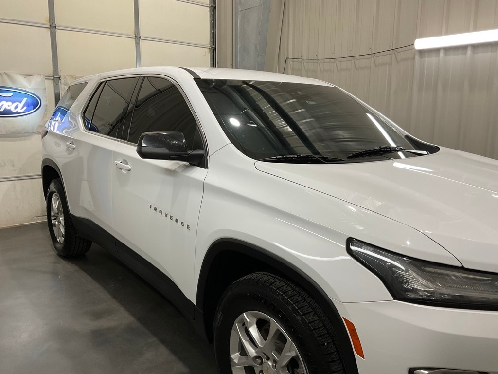 Preferred Equipment Group 1LS, Traverse LS, 4D Sport Utility, 3.6L V6 SIDI VVT, FWD, Summit White, Jet Black/Chai Cloth, 2-Way Manual Front Passenger Seat Adjuster, 3.49 Axle Ratio, 3rd row seats: split-bench, 4-Wheel Disc Brakes, 6 Speakers, 6-Speaker Audio System Feature, 6-Way Manual Driver Seat Adjuster, ABS brakes, Air Conditioning, Alloy wheels, AM/FM radio: SiriusXM, Apple CarPlay/Android Auto, Auto High-beam Headlights, Automatic temperature control, Brake assist, Bumpers: body-color, Compass, Delay-off headlights, Driver door bin, Driver vanity mirror, Dual front impact airbags, Dual front side impact airbags, Electronic Stability Control, Emergency communication system: OnStar Guidance, Four wheel independent suspension, Front anti-roll bar, Front Bucket Seats, Front Center Armrest, Front dual zone A/C, Front reading lights, Fully automatic headlights, Heated door mirrors, Illuminated entry, Low tire pressure warning, Occupant sensing airbag, Outside temperature display, Overhead airbag, Overhead console, Panic alarm, Passenger door bin, Passenger vanity mirror, Power door mirrors, Power steering, Power windows, Premium Cloth Seat Trim, Radio data system, Radio: Chevrolet Infotainment System AM/FM Stereo, Rear air conditioning, Rear anti-roll bar, Rear reading lights, Rear View Camera, Rear window defroster, Rear window wiper, Remote keyless entry, Security system, SiriusXM Radio, Speed control, Speed-sensing steering, Split folding rear seat, Spoiler, Steering wheel mounted audio controls, Tachometer, Telescoping steering wheel, Tilt steering wheel, Traction control, Trip computer, Variably intermittent wipers, Voltmeter, and Wheels: 18" Bright Silver Painted Aluminum.
