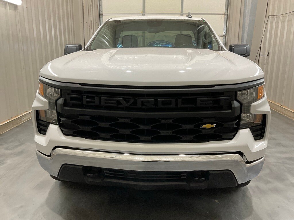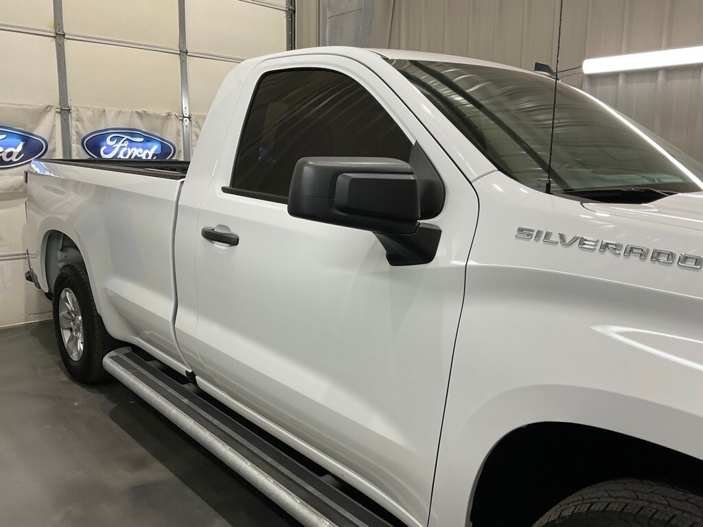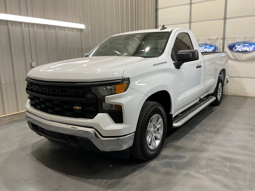 Preferred Equipment Group 1WT (3.5" Monochromatic Display Driver Info Center, Black (Semi-Gloss) Front Bumper, Black (Semi-Gloss) Rear Bumper, Bluetooth® For Phone, Chevrolet Connected Access Capable, Electrical Steering Column Lock, Front Frame-Mounted Black Recovery Hooks, HD Rear Vision Camera, Heated Power-Adjustable Outside Mirrors, Inside Rear-View Mirror w/Tilt, Locking Tailgate, Manual Tailgate Function w/No EZ Lift, Manual Tilt Wheel Steering Column, OnStar & Chevrolet Connected Services Capable, Power Front Windows w/Driver Express Up/Down, Power Front Windows w/Passenger Express Down, Remote Keyless Entry, Rubberized-Vinyl Floor Covering, SiriusXM Delete, Solar Absorbing Tinted Glass, Standard Tailgate, and Wi-Fi Hot Spot Capable), Standard Suspension Package, Silverado 1500 WT, 2D Standard Cab, EcoTec3 5.3L V8, 10-Speed Automatic, RWD, Summit White, Black Cloth, 170 Amp Alternator, 2 Speakers, 2-Speaker Audio System, 220 Amp Alternator, 4-Wheel Disc Brakes, 40/20/40 Front Split Bench Seat, ABS brakes, Air Conditioning, Auto High-beam Headlights, Automatic Emergency Braking, Auxiliary External Transmission Oil Cooler, Brake assist, Compass, Delay-off headlights, Driver door bin, Dual front impact airbags, Dual front side impact airbags, Electronic Cruise Control, Electronic Stability Control, External Engine Oil Cooler, EZ Lift Power Lock & Release Tailgate, Following Distance Indicator, Forward Collision Alert, Front anti-roll bar, Front Center Armrest w/Storage, Front Chrome Bumper, Front License Plate Kit, Front Pedestrian Braking, Front reading lights, Front wheel independent suspension, Fully automatic headlights, Heated door mirrors, Illuminated entry, IntelliBeam Automatic High Beam On/Off, Lane Keep Assist w/Lane Departure Warning, Low tire pressure warning, Occupant sensing airbag, Outside temperature display, Overhead airbag, Overhead console, Panic alarm, Passenger door bin, Passenger vanity mirror, Power door mirrors, Power steering, Power windows, Premium audio system: Chevrolet Infotainment 3, Radio data system, Radio: Chevrolet Infotainment 3 System, Rear Chrome Bumper, Rear reading lights, Rear step bumper, Remote keyless entry, Speed-sensing steering, Tachometer, Tilt steering wheel, Traction control, Trip computer, Variably intermittent wipers, Vinyl Seat Trim, Voltmeter, Wheels: 17" x 8" Bright Silver Painted Aluminum, and Wheels: 17" x 8" Ultra Silver Painted Steel.