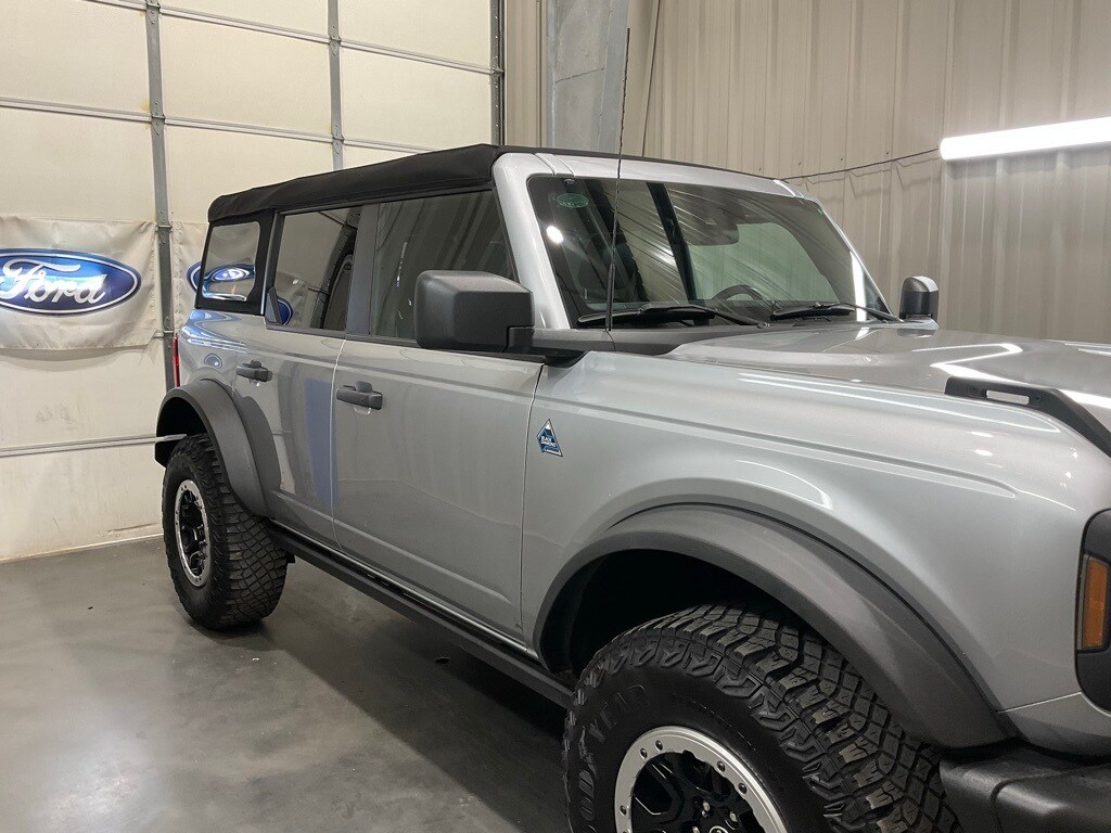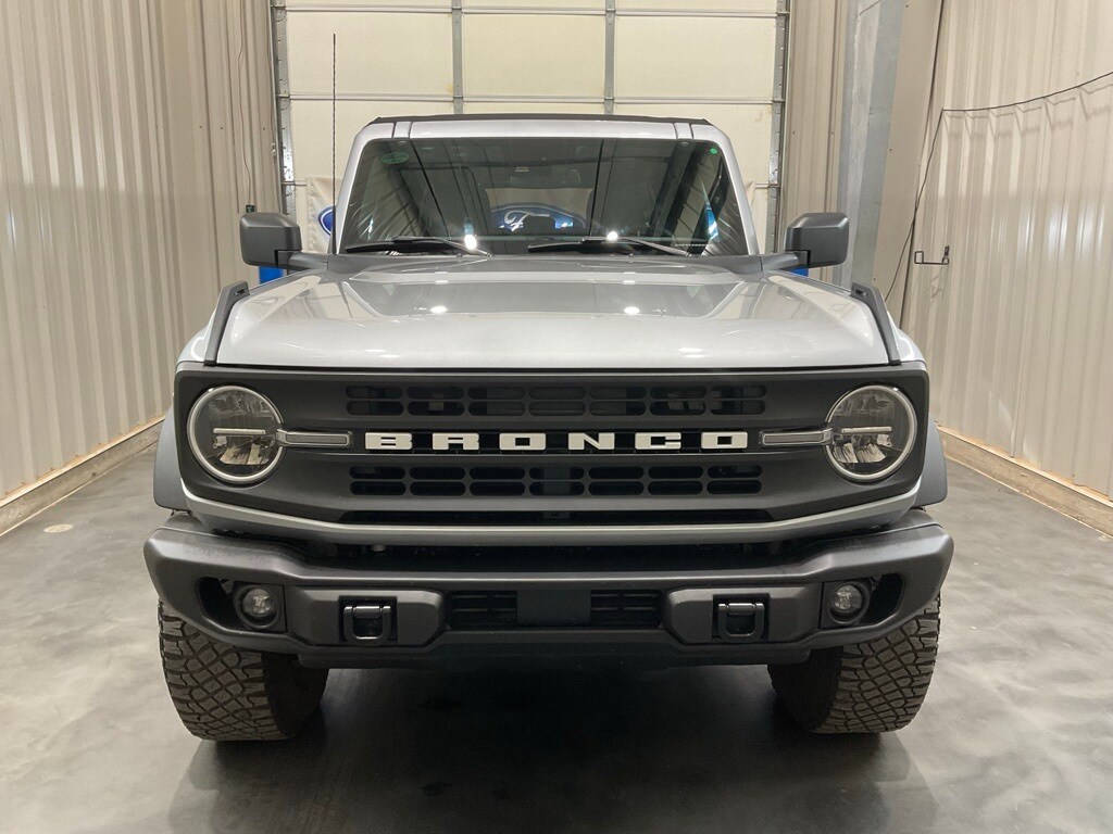 Equipment Group 322A Mid Package (2-Door Intelligent Access w/Lock/Unlock, Ambient Footwell Lighting, Auto-Dimming Interior Rear-View Mirror, Connected Navigation, Dr & Pass Illuminated Sliding Visor Vanity Mirrors, Dual-Zone Electronic Automatic Temperature Control, Enhanced Voice Recognition, Front Row Heated Seats, Power Outlet - Back Side of Center Floor Console, Rear Parking Sensors, and Remote Start System), Sasquatch Package (4.7 Final Drive Ratio, High Clearance Fender Flares, High Clearance Suspension, Position-Sensitive Bilstein Shock Absorbers, and Wheels: 17" Black High Gloss-Painted Aluminum), Bronco Black Diamond, 4D Sport Utility, 2.3L EcoBoost I-4, 4WD, Silver Metallic, Dark Gray W/Black Onyx Leather, 4-Wheel Disc Brakes, 6 Speakers, ABS brakes, Air Conditioning, AM/FM radio: SiriusXM with 360L, AM/FM Stereo, Auto High-Beam Headlamps, Auto High-beam Headlights, BLIS Blind Spot Information System, Brake assist, Compass, Delay-off headlights, Driver door bin, Driver vanity mirror, Dual front impact airbags, Dual front side impact airbags, Electronic Stability Control, Emergency communication system: 911 Assist, Front anti-roll bar, Front Bucket Seats, Front Center Armrest, Front reading lights, Front wheel independent suspension, Fully automatic headlights, Heated door mirrors, Illuminated entry, Integrated roll-over protection, Lane-Keeping System, Leather Shift Knob, Low tire pressure warning, Marine Grade Vinyl Bucket Seats, Occupant sensing airbag, Outside temperature display, Overhead airbag, Overhead console, Panic alarm, Passenger door bin, Passenger vanity mirror, Power door mirrors, Power steering, Power windows, Pre-Collision Assist w/Automatic Emergency Braking, Radio data system, Rear View Camera, Rear-View Camera, Remote keyless entry, Security system, SiriusXM Radio w/360L, Speed control, Split folding rear seat, Steering wheel mounted audio controls, SYNC 4, Tachometer, Telescoping steering wheel, Tilt steering wheel, Traction control, Trip computer, Variably intermittent wipers, and Wheels: 17" Black Gloss-Painted Steel.