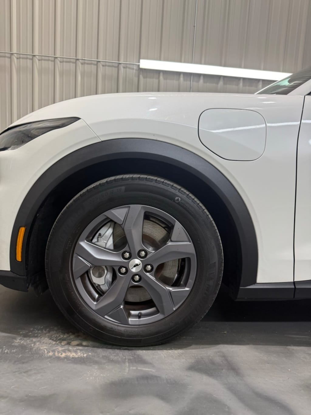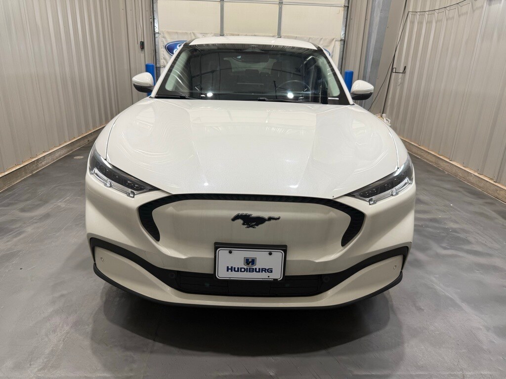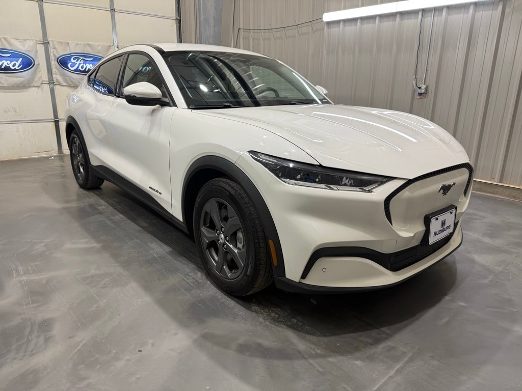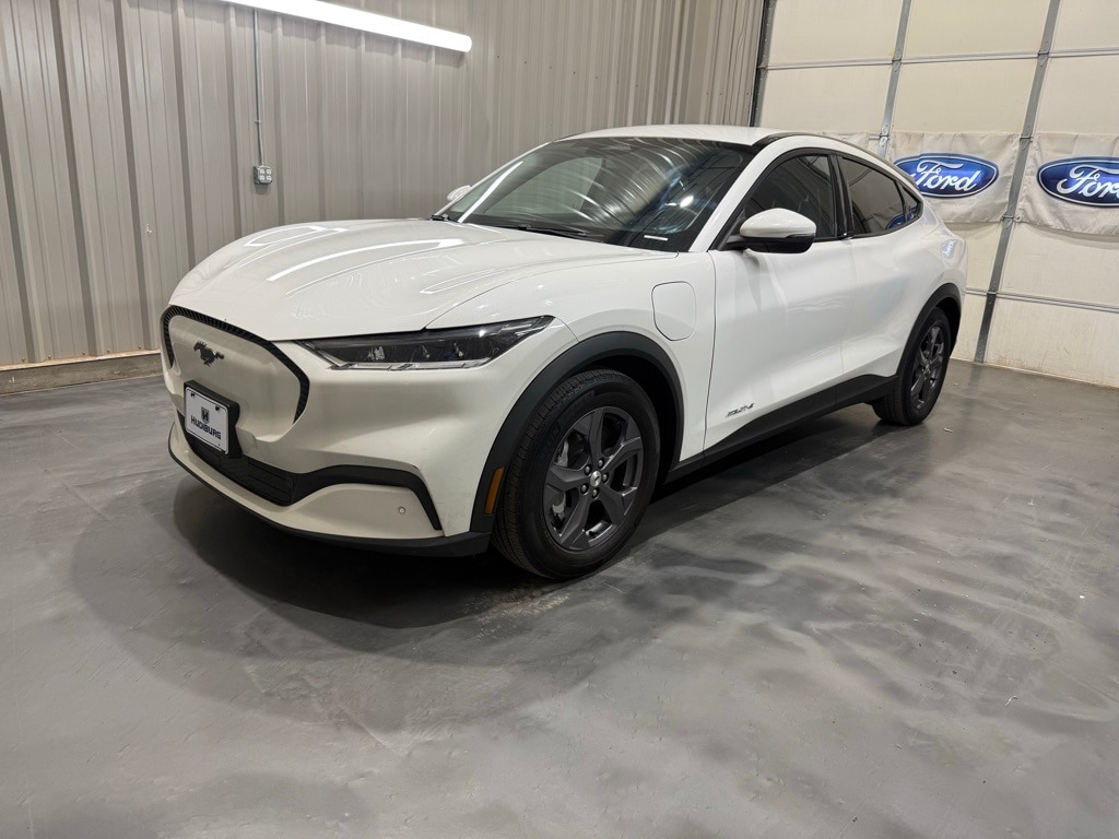 Equipment Group 100A, Interior Protection Package (Pre-Installed) (Cargo Area Protector and Front & Rear Floor Liners), Mustang Mach-E Select, 4D Sport Utility, Electric Motor, RWD, Star White Metallic Tri-Coat, Black Onyx, 4-Wheel Disc Brakes, 6 Speakers, ABS brakes, ActiveX Bucket Seats, Air Conditioning, Alloy wheels, AM/FM radio: SiriusXM with 360L, AM/FM Stereo, Apple CarPlay/Android Auto, Auto High-beam Headlights, Auto-dimming Rear-View mirror, Automatic temperature control, Axle Ratio: 9.05, Brake assist, Bumpers: body-color, Compass, Delay-off headlights, Driver door bin, Driver vanity mirror, Dual front impact airbags, Dual front side impact airbags, Electronic Stability Control, Emergency communication system: 911 Assist, Four wheel independent suspension, Front anti-roll bar, Front Bucket Seats, Front Center Armrest, Front dual zone A/C, Front reading lights, Fully automatic headlights, Garage door transmitter, Heated door mirrors, Illuminated entry, Knee airbag, Low tire pressure warning, Navigation system: Connected Navigation, Occupant sensing airbag, Outside temperature display, Overhead airbag, Overhead console, Panic alarm, Passenger door bin, Passenger vanity mirror, Power door mirrors, Power driver seat, Power steering, Power windows, Radio data system, Rain sensing wipers, Rear anti-roll bar, Rear seat center armrest, Rear side impact airbag, Rear View Camera, Rear window defroster, Rear window wiper, Remote keyless entry, Security system, SiriusXM Radio w/360L, Speed control, Speed-sensing steering, Speed-Sensitive Wipers, Split folding rear seat, Spoiler, Steering wheel mounted audio controls, SYNC 4A w/Enhanced Voice Recognition, Telescoping steering wheel, Tilt steering wheel, Traction control, Trip computer, Turn signal indicator mirrors, Variably intermittent wipers, and Wheels: 18" Carbonized Gray-Painted Aluminum.