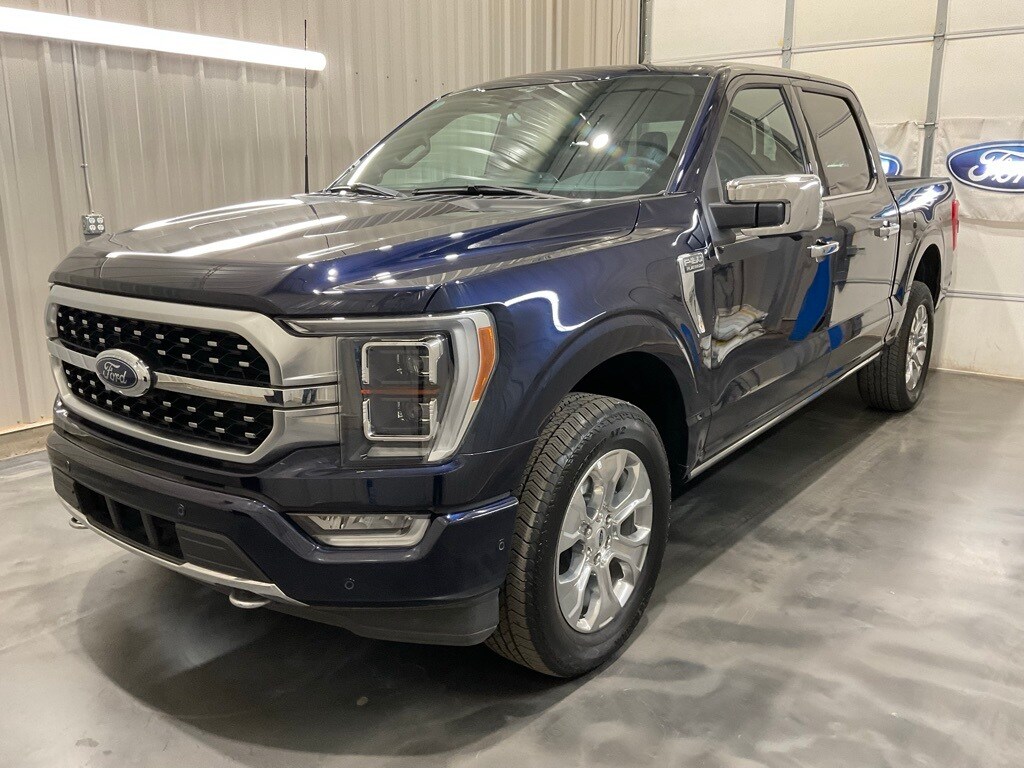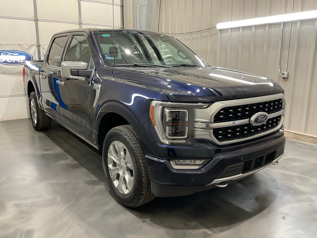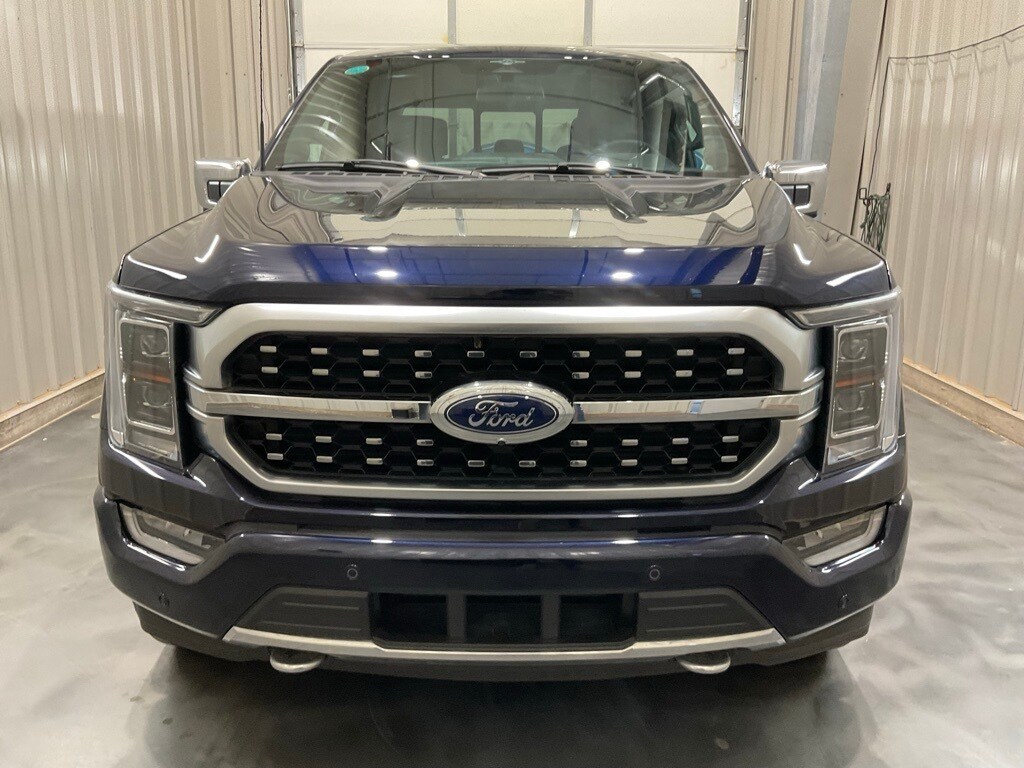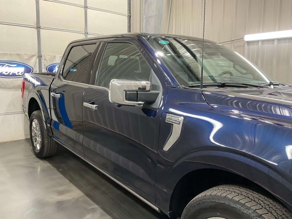 Bed Utility Package (BoxLink, LED Box Lighting, Power Tailgate, and Tailgate Step w/Tailgate Work Surface), Equipment Group 701A High (360 Degree Camera, Pro Trailer Backup Assist & Pro Trailer Hitch Assist, and Radio: B&O Unleashed Sound System by Bang & Olufsen), Ford BlueCruise 1.0 (Active Park Assist 2.0), Max Trailer Tow Package (Class IV Trailer Hitch Receiver, Extended Range 36 Gallon Fuel Tank, and Integrated Trailer Brake Controller), F-150 Platinum, 4D SuperCrew, 3.5L V6 EcoBoost, 4WD, Blue Metallic, Black Leather, 20" Polished Aluminum Wheels, 4-Wheel Disc Brakes, 8 Speakers, ABS brakes, Active Park Assist 2.0 Removal, Adjustable pedals, Air Conditioning, Alloy wheels, AM/FM radio: SiriusXM with 360L, Auto High-beam Headlights, Auto tilt-away steering wheel, Auto-dimming door mirrors, Auto-dimming Rear-View mirror, Automatic temperature control, Brake assist, Bumpers: body-color, Center High-Mounted Stop Lamp CHMSL Camera Removal, Compass, Delay-off headlights, Driver door bin, Driver vanity mirror, Dual front impact airbags, Dual front side impact airbags, Electronic Stability Control, Emergency communication system: SYNC 4 911 Assist, Front anti-roll bar, Front Bucket Seats, Front Center Armrest, Front dual zone A/C, Front fog lights, Front License Plate Bracket, Front reading lights, Front wheel independent suspension, Fully automatic headlights, Garage door transmitter, Heated door mirrors, Heated Front Seats, Heated Rear Seats, Heated steering wheel, Illuminated entry, Inclination/Intrusion Sensor Removal, Low tire pressure warning, Memory seat, Multicontour Seats w/Active Motion Removal, Occupant sensing airbag, Outside temperature display, Overhead airbag, Overhead console, Panic alarm, Passenger door bin, Passenger vanity mirror, Pedal memory, Power door mirrors, Power driver seat, Power passenger seat, Power steering, Power windows, Radio data system, Radio: B&O Sound System by Bang & Olufsen, Rain sensing wipers, Rear reading lights, Rear seat center armrest, Rear step bumper, Rear View Camera, Rear window defroster, Remote keyless entry, Security system, Speed control, Speed-sensing steering, Split folding rear seat, Steering Wheel Heat Removal (DISC), Steering wheel memory, Steering wheel mounted audio controls, SYNC 4 w/Enhanced Voice Recognition, Tachometer, Telescoping steering wheel, Tilt steering wheel, Traction control, Trip computer, Turn signal indicator mirrors, Twin Panel Moonroof, Unique Multi-Contour Leather Bucket Seats, Variably intermittent wipers, Ventilated front seats, and Voltmeter.