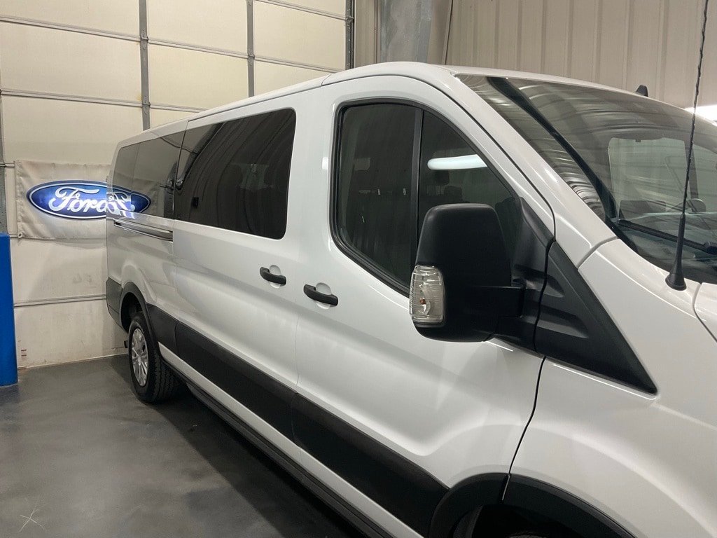 Transit-350 XLT, Passenger Van, EcoBoost 3.5L V6 GTDi DOHC 24V Twin Turbocharged, RWD, Oxford White, Gray Cloth, 3.73 Axle Ratio, 3rd row seats: split-bench, 4-Wheel Disc Brakes, 4th-Row Bench Seat, 8 Speakers, ABS brakes, Air Conditioning, AM/FM radio, Auto High-beam Headlights, Auto Start-Stop Delete, Brake assist, Cloth Front Bucket Seats, Delay-off headlights, Driver door bin, Driver vanity mirror, Driver's Seat Mounted Armrest, Dual front impact airbags, Dual front side impact airbags, Ebony Cloth Bucket Seats, Electronic Air Temperature Control, Electronic Stability Control, Front anti-roll bar, Front Bucket Seats, Front Fog Lamps, Front License Plate Bracket, Front reading lights, Front Sensing System, Front wheel independent suspension, Fully automatic headlights, Illuminated entry, Large Center Console, Low tire pressure warning, Occupant sensing airbag, Overhead airbag, Panic alarm, Passenger door bin, Passenger seat mounted armrest, Passenger vanity mirror, Power door mirrors, Power steering, Power windows, Privacy Glass, Radio: AM/FM Stereo w/SYNC 4 & Nav, Radio: AM/FM Stereo w/SYNC 4/SiriusXM w/360L/Nav, Rain sensing wipers, Rear air conditioning, Rear window defroster, Remote keyless entry, Reverse Sensing System, Side Sensing System, Steering wheel mounted audio controls, Tachometer, Telescoping steering wheel, Tilt steering wheel, Traction control, Variably intermittent wipers, and Wheels: 16" Steel w/Full Silver Cover.