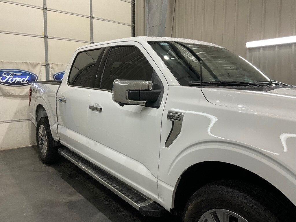 Equipment Group 501A Standard, Tow/Haul Package, F-150 Lariat, 4D SuperCrew, 3.5L V6 EcoBoost, 4WD, Oxford White, Black W/Smoked Truffle Leather, 4-Wheel Disc Brakes, 8 Speakers, ABS brakes, Adjustable pedals, Air Conditioning, Alloy wheels, AM/FM radio: SiriusXM with 360L, Auto High-beam Headlights, Auto-dimming door mirrors, Auto-dimming Rear-View mirror, Automatic temperature control, Brake assist, Bumpers: chrome, Chrome wheels, Compass, Delay-off headlights, Driver door bin, Driver vanity mirror, Dual front impact airbags, Dual front side impact airbags, Electronic Stability Control, Emergency communication system: SYNC 4 911 Assist, Front anti-roll bar, Front Bucket Seats, Front Center Armrest, Front dual zone A/C, Front fog lights, Front reading lights, Front wheel independent suspension, Fully automatic headlights, Garage door transmitter, Heated door mirrors, Heated Front Seats, Heated steering wheel, Illuminated entry, Leather-Trimmed Bucket Seats, Low tire pressure warning, Memory seat, Navigation system: Connected Navigation, Occupant sensing airbag, Outside temperature display, Overhead airbag, Overhead console, Panic alarm, Passenger door bin, Passenger vanity mirror, Pedal memory, Power door mirrors, Power driver seat, Power passenger seat, Power steering, Power windows, Radio data system, Radio: B&O Sound System by Bang & Olufsen, Rain sensing wipers, Rear reading lights, Rear seat center armrest, Rear step bumper, Rear window defroster, Remote keyless entry, Security system, Speed control, Split folding rear seat, Steering wheel mounted audio controls, SYNC 4 w/Enhanced Voice Recognition, Tachometer, Telescoping steering wheel, Tilt steering wheel, Tough Bed Spray-In Bedliner, Traction control, Trip computer, Turn signal indicator mirrors, Variably intermittent wipers, Ventilated front seats, Voltmeter, and Wheels: 20" Chrome-Like PVD.