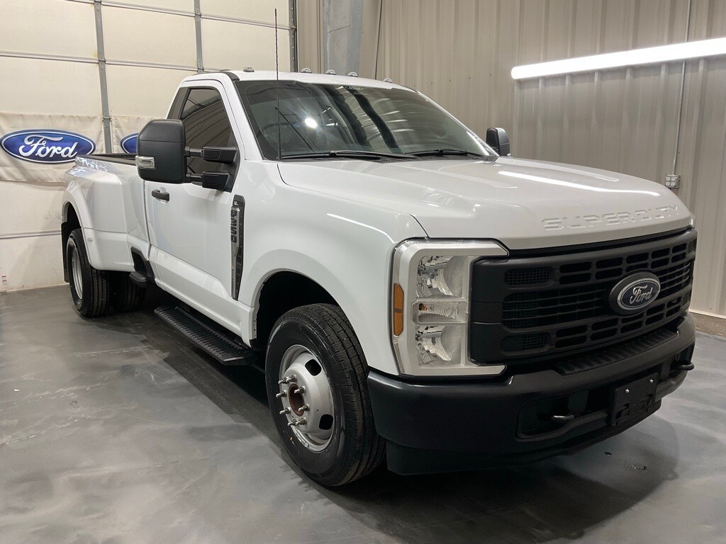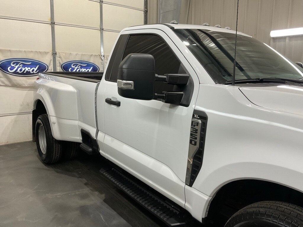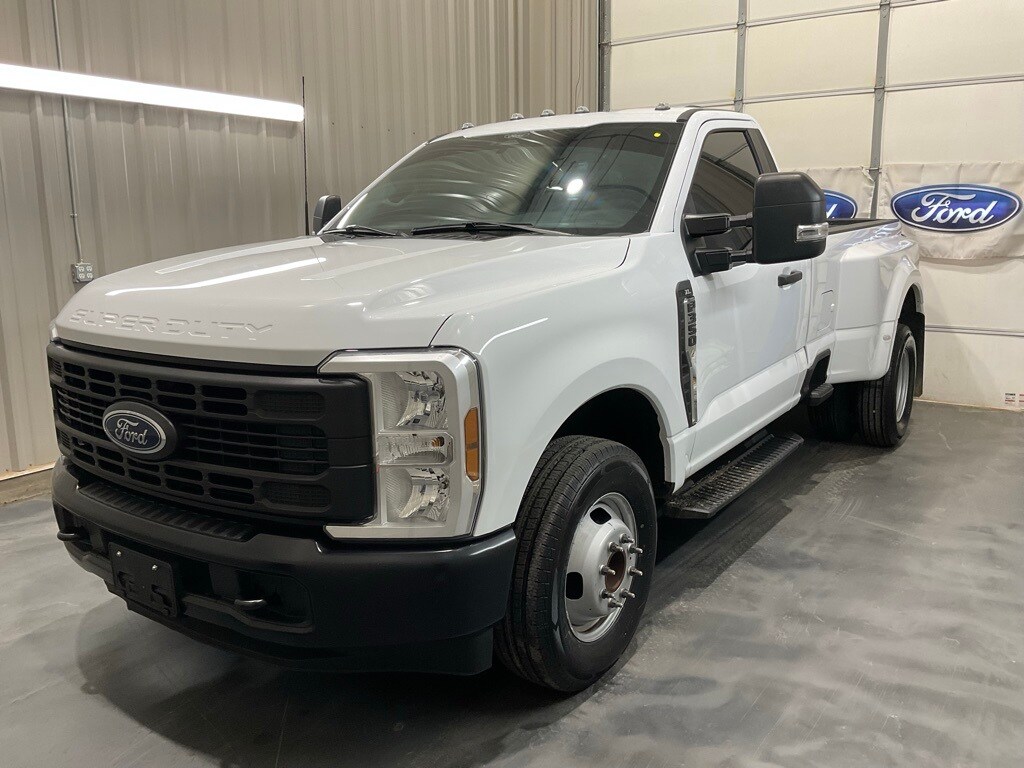 Camper Package (Rear Stabilizer Bar & Auxiliary Springs), GVWR: 14,000 lb Payload Package, Order Code 620A, F-350 SuperDuty XL DRW, 2D Standard Cab, 6.8L V8, RWD, Oxford White, Medium Earth Gray Vinyl, 17" Argent Painted Steel Wheels, 190 Amp Alternator, 4 Speakers, 4-Wheel Disc Brakes, ABS brakes, Air Conditioning, AM/FM radio, AM/FM Stereo w/MP3 Player, Brake assist, Compass, Delay-off headlights, Dual front impact airbags, Dual front side impact airbags, Dual rear wheels, Electronic Stability Control, Emergency communication system: SYNC 4 911 Assist, Front anti-roll bar, Front Center Armrest w/Storage, Front reading lights, Front wheel independent suspension, Fully automatic headlights, HD Vinyl 40/20/40 Split Bench Seat, Heated door mirrors, Illuminated entry, Limited Slip w/4.30 Axle Ratio, Low tire pressure warning, Outside temperature display, Overhead airbag, Overhead console, Panic alarm, Passenger cancellable airbag, Passenger vanity mirror, Platform Running Boards, Power door mirrors, Power steering, Power windows, Rear anti-roll bar, Rear step bumper, Rear View Camera, Remote keyless entry, Remote Start System, Speed control, Steering wheel mounted audio controls, SYNC 4, Tachometer, Telescoping steering wheel, Tilt steering wheel, Traction control, Trip computer, Turn signal indicator mirrors, Upfitter Switches (6), and Variably intermittent wipers.