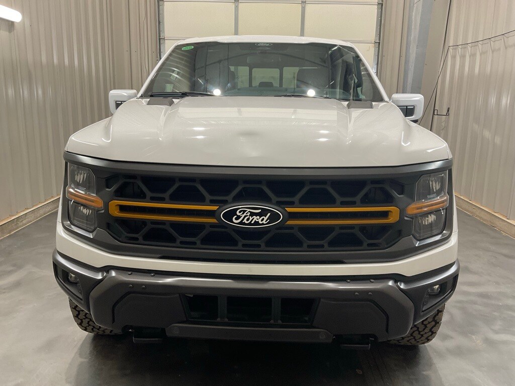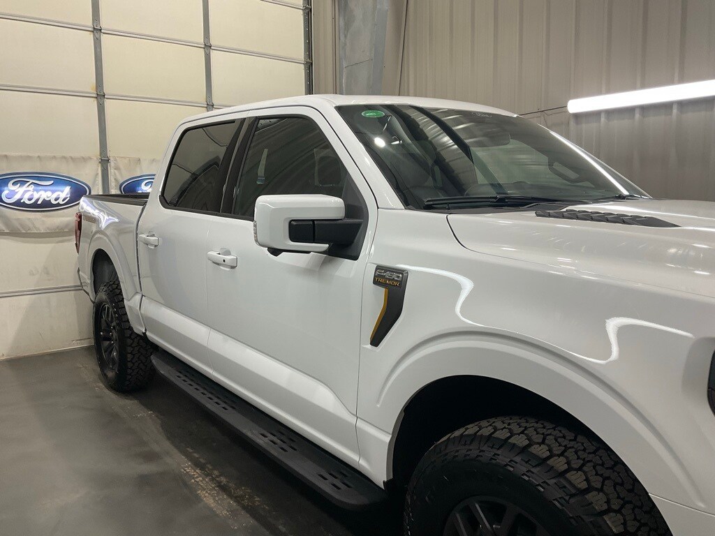 Bed Utility Package (4 Pickup Box Tie-Down Plates, LED Box Lighting, and Power Tailgate), Equipment Group 402A High (2nd Row Heated Seats, Ambient Lighting, Auto-Dimming Rear-View Mirror, Front Axle w/Torsen Differential, Heads-Up Display, Heated Steering Wheel, LED Taillamps, Media Bin Door, Modular Front Bumper & Carbon Black Rear Bumper, Power Glass Heated Sideview Mirrors, Power-Adjustable Pedals w/Memory, Premium Wrapped Steering Wheel, Radio: B&O Unleashed Sound System by Bang & Olufsen, Rain-Sensing Wipers, Two-Speed Automatic AWD w/Mechanical Locking 4WD, Unique Tremor Leather-Trimmed Bucket Seats, and Universal Garage Door Opener), Mobile Office Package (Console Worksurface, Partitioned Lockable Rear Storage, and Wireless Charging), Tow/Haul Package (Integrated Trailer Brake Controller), GVWR: 7,100 lbs Payload Package, F-150 Tremor, 4D SuperCrew, 5.0L V8, 4WD, Oxford White, Black Leather, Navigation system: Connected Navigation, Twin Panel Moonroof, 4-Wheel Disc Brakes, 8 Speakers, ABS brakes, Adjustable pedals, Air Conditioning, Alloy wheels, AM/FM radio: SiriusXM with 360L, Auto High-beam Headlights, Auto-dimming door mirrors, Auto-dimming Rear-View mirror, Automatic temperature control, Brake assist, Bumpers: body-color, Compass, Delay-off headlights, Driver door bin, Driver vanity mirror, Dual front impact airbags, Dual front side impact airbags, Electronic Locking w/3.73 Axle Ratio, Electronic Stability Control, Emergency communication system: SYNC 4 911 Assist, Front anti-roll bar, Front Bucket Seats, Front Center Armrest, Front dual zone A/C, Front fog lights, Front License Plate Bracket, Front reading lights, Front wheel independent suspension, Fully automatic headlights, Heated door mirrors, Heated Front Seats, Illuminated entry, Low tire pressure warning, Occupant sensing airbag, Outside temperature display, Overhead airbag, Overhead console, Panic alarm, Passenger door bin, Passenger vanity mirror, Power door mirrors, Power driver seat, Power passenger seat, Power steering, Power windows, Radio data system, Radio: B&O Sound System by Bang & Olufsen, Rear reading lights, Rear step bumper, Rear window defroster, Remote keyless entry, Security system, Speed control, Split folding rear seat, Steering wheel mounted audio controls, SYNC 4 w/Enhanced Voice Recognition, Tachometer, Tailgate Step w/Tailgate Work Surface, Telescoping steering wheel, Tilt steering wheel, Traction control, Trip computer, Turn signal indicator mirrors, Unique Sport Cloth 40/Console/40 Power Front Seat, Variably intermittent wipers, Voltmeter, and Wheels: 18" Alloy w/Dark Matte Finish.