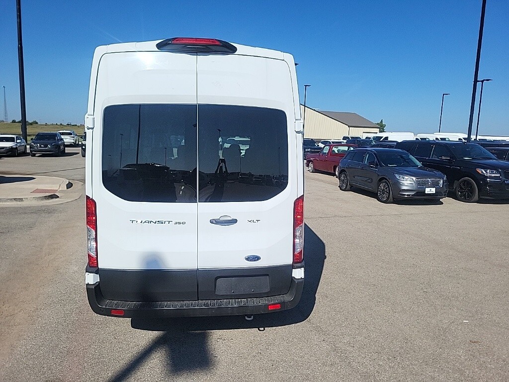 Transit-350 XLT, Passenger Van, 3.5L V6 Flex Fuel, RWD, Oxford White, Gray Cloth, 15-Passenger Seats, 3rd row seats: split-bench, 4-Wheel Disc Brakes, 4.10 Limited-Slip Axle Ratio, 4th-Row Bench Seat, 8 Speakers, ABS brakes, Air Conditioning, AM/FM radio, Auto High-beam Headlights, Brake assist, Cloth Front Bucket Seats, Dark Palazzo Gray Cloth Bucket Seats, Delay-off headlights, Driver door bin, Driver vanity mirror, Driver's Seat Mounted Armrest, Dual front impact airbags, Dual front side impact airbags, Electronic Air Temperature Control, Electronic Stability Control, Front anti-roll bar, Front Bucket Seats, Front Fog Lamps, Front License Plate Bracket, Front reading lights, Front Sensing System, Front wheel independent suspension, Fully automatic headlights, Illuminated entry, Large Center Console, Low tire pressure warning, Occupant sensing airbag, Overhead airbag, Panic alarm, Passenger door bin, Passenger seat mounted armrest, Passenger vanity mirror, Power door mirrors, Power steering, Power windows, Privacy Glass, Radio: AM/FM Stereo w/SYNC 4 & Nav, Rain sensing wipers, Rear air conditioning, Rear window defroster, Rear-Window Defroster, Remote keyless entry, Reverse Sensing System, Side Sensing System, Speed control, Steering wheel mounted audio controls, Tachometer, Telescoping steering wheel, Tilt steering wheel, Traction control, Variably intermittent wipers, and Wheels: 16" Steel w/Full Silver Cover.