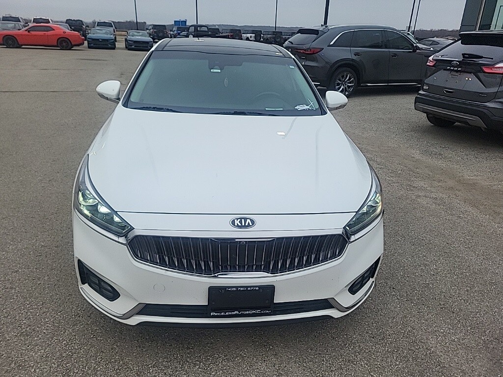 Cadenza Limited, 4D Sedan, 3.3L DOHC, FWD, Snow White Pearl, Black Leather, 12 Speakers, 4-Wheel Disc Brakes, ABS brakes, Air Conditioning, Alloy wheels, AM/FM radio: SiriusXM, Apple CarPlay & Android Auto, Auto High-beam Headlights, Auto tilt-away steering wheel, Auto-dimming Rear-View mirror, Automatic temperature control, Brake assist, Bumpers: body-color, Cargo Net, CD player, Compass, Delay-off headlights, Driver door bin, Driver vanity mirror, Dual front impact airbags, Dual front side impact airbags, Electronic Stability Control, Emergency communication system: UVO eServices, Four wheel independent suspension, Front anti-roll bar, Front Bucket Seats, Front Center Armrest w/Storage, Front dual zone A/C, Front fog lights, Front reading lights, Fully automatic headlights, Garage door transmitter: HomeLink, harman/kardon® Speakers, Heads-Up Display, Heated & Ventilated Front Bucket Seats, Heated door mirrors, Heated Front Seats, Heated Rear Seats, Heated steering wheel, Illuminated entry, Knee airbag, Leather Shift Knob, Low tire pressure warning, Memory seat, Navigation System, Occupant sensing airbag, Outside temperature display, Overhead airbag, Overhead console, Panic alarm, Passenger door bin, Passenger vanity mirror, Power door mirrors, Power driver seat, Power Moonroof, Power passenger seat, Power steering, Power windows, Premium Quilted Nappa Leather Seat Trim, Radio data system, Radio: AM/FM/MP3 UVO eServices w/Premium Nav, Rain sensing wipers, Rear reading lights, Rear seat center armrest, Rear side impact airbag, Rear Window Blind, Rear window defroster, Remote keyless entry, Security system, Speed control, Steering wheel memory, Steering wheel mounted audio controls, Tachometer, Telescoping steering wheel, Tilt steering wheel, Traction control, Trip computer, Turn signal indicator mirrors, Variably intermittent wipers, Ventilated front seats, Wheel Locks, and Wheels: 8.0J x 19" Dark Satin Alloy.