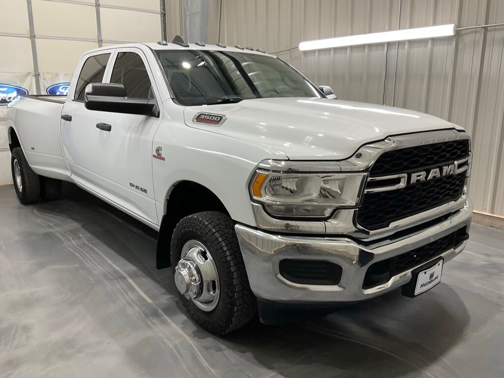 Chrome Appearance Group (Bright Front Bumper, Bright Rear Bumper, Bright Wheel Skins, Center Hub, Chrome Grille Surround, and Matte Black Mesh w/Chrome Grille), Protection Group, Quick Order Package 2HA Tradesman, Tradesman Level 2 Equipment Group (2 Way Rear Headrest Seat, 4 Way Front Headrests, 40/20/40 Split Bench Seat, Carpet Floor Covering, Cloth 40/20/40 Bench Seat, Front Armrest w/Cupholders, Manual Adjust 4-Way Driver Seat, Manual Adjust 4-Way Front Passenger Seat, Rear Folding Seat, Rear Power Sliding Window, Rear Window Defroster, and Storage Tray), 3500 Tradesman, 4D Crew Cab, Cummins 6.7L I6 Turbodiesel, 4WD, Bright White Clearcoat, Black Cloth, 115V Auxiliary Front Power Outlet, 3.73 Axle Ratio, 4-Wheel Disc Brakes, 400W Inverter, 4G LTE Wi-Fi Hot Spot, 50 Gallon Fuel Tank, 5th Wheel/Gooseneck Towing Prep Group, 6 Speakers, 6000# Front Axle w/Hub Ext, 8.4" Touchscreen Display, ABS brakes, Active Noise Control System, Air Conditioning, All R1 Low Radios, All Radio Equipped Vehicles, AM/FM radio, Apple CarPlay, Black Exterior Mirrors, Bluetooth Handsfree Phone & Audio, Box & Rear Fender Clearance Lamps, Brake assist, Clearance Lamps, Cluster 3.5" TFT Color Display, Compass, Connectivity - US/Canada, Dash Pass Thru Wire Circuits, Delay-off headlights, Driver door bin, Dual front impact airbags, Dual front side impact airbags, Dual Rear Wheels, Electric Shift-On-The-Fly Transfer Case, Electronic Stability Control, Electronically Controlled Throttle, Emergency communication system: SiriusXM Guardian, Exterior 115V AC Outlet, For Details Visit DriveUconnect.com, Front anti-roll bar, Front Center Armrest w/Storage, Front License Plate Bracket, Front reading lights, Fully automatic headlights, Global Telematics Box Module (TBM), Google Android Auto, GPS Antenna Input, HD Vinyl 40/20/40 Split Bench Seat, Heated door mirrors, I/P Mounted Auxiliary Switches, Illuminated entry, Integrated Center Stack Radio, Integrated Voice Command w/Bluetooth, Low tire pressure warning, Occupant sensing airbag, Outside temperature display, Overhead airbag, Overhead console, ParkSense Rear Park Assist System, ParkView Rear Back-Up Camera, Passenger door bin, Passenger vanity mirror, Power door mirrors, Power steering, Power windows, Radio data system, Radio: Uconnect 3 w/5" Display, Radio: Uconnect 5 w/8.4" Display, Rear step bumper, Rear Wheelhouse Liners, Selectable Tire Fill Alert, SiriusXM Satellite Radio, Speed control, Tachometer, Tilt steering wheel, Tip Start, Traction control, Trailer Brake Control, Trailer Light Check, Turn signal indicator mirrors, Variably intermittent wipers, Voltmeter, Wheels: 17" x 6.0" Steel Argent, Wheels: 17" x 6.0" Steel Chrome Clad, and Wheels: 18" x 8.0" SteeL.